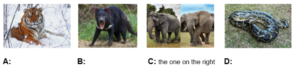 a) Siberian Tiger b) Tasmanian Devil c) African Elephant d) Burmese Python |