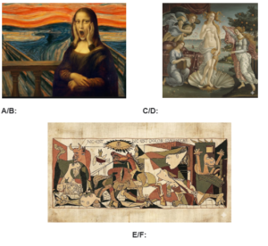 a) Mona Lisa (Da Vinci) b) The Scream (Munsch) c) The Birth od Venus (Botticelli) d) Venus of Urbino (Titian or Titan) e) Guernica (Picasso) f) The Bayeux Tapestry (???) |